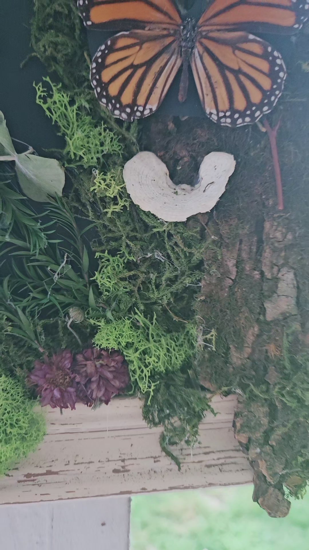 Breathed into being beneath moonlight, this 11x14 cascading 3d enchanted art piece is crafted with garden-grown lavender and eucalyptus, foraged bark and woodland mushrooms, forest moss, being visited by a preserved butterfly, who now dreams among the greens.