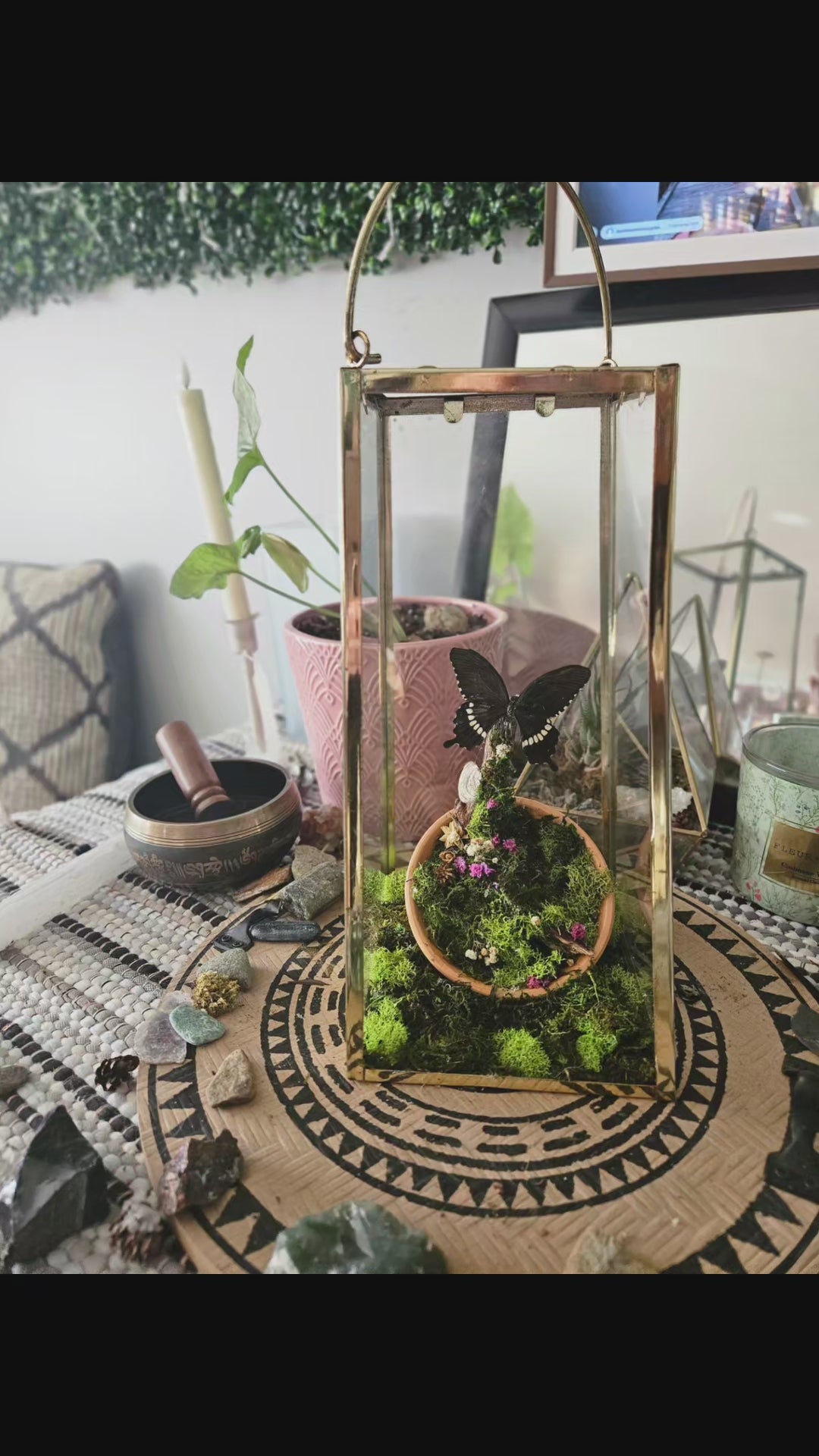 Once a forgotten lantern, now reborn as a doorway to the fae realm — this golden glass sanctuary holds a world where magic never sleeps. Inside, a preserved butterfly rests upon a mossy hill, surrounded by soft blooms and whispers of the forest. 🌿🦋