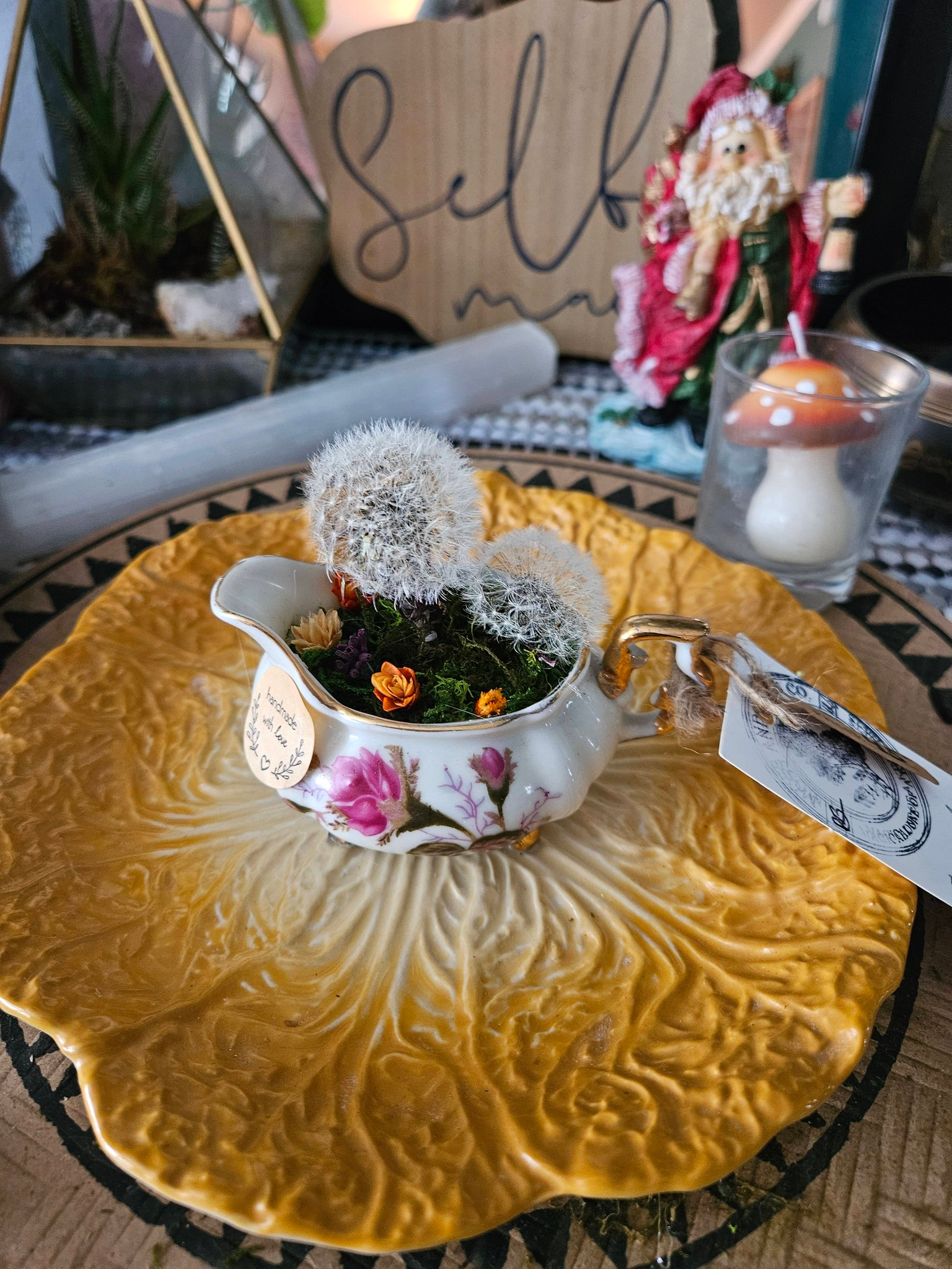 This Jewelry Holder, made with the base of two thrifted items, is a reminder to take time to be present and slow down. Encouraging gentle energy and a place to connect both to body and soul at the beginning of the day as you adorn yourself, and the end as you take off your pieces. Enjoy every moment.