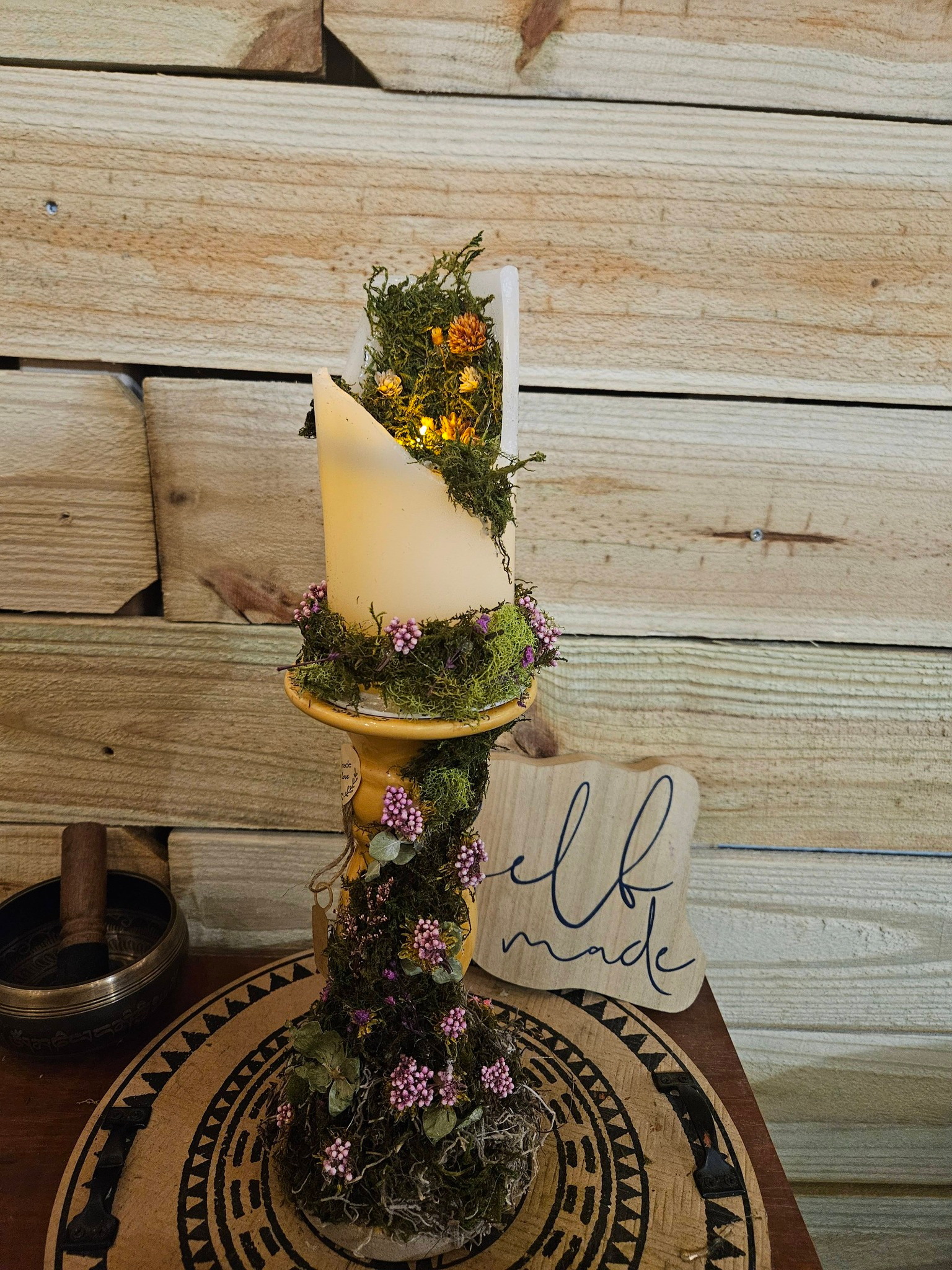 At its heart rests a flickering flameless candle — created from a broken candle with a matching design. The quiet flame that dances safely among the greenery, illuminating the piece with a golden serenity.