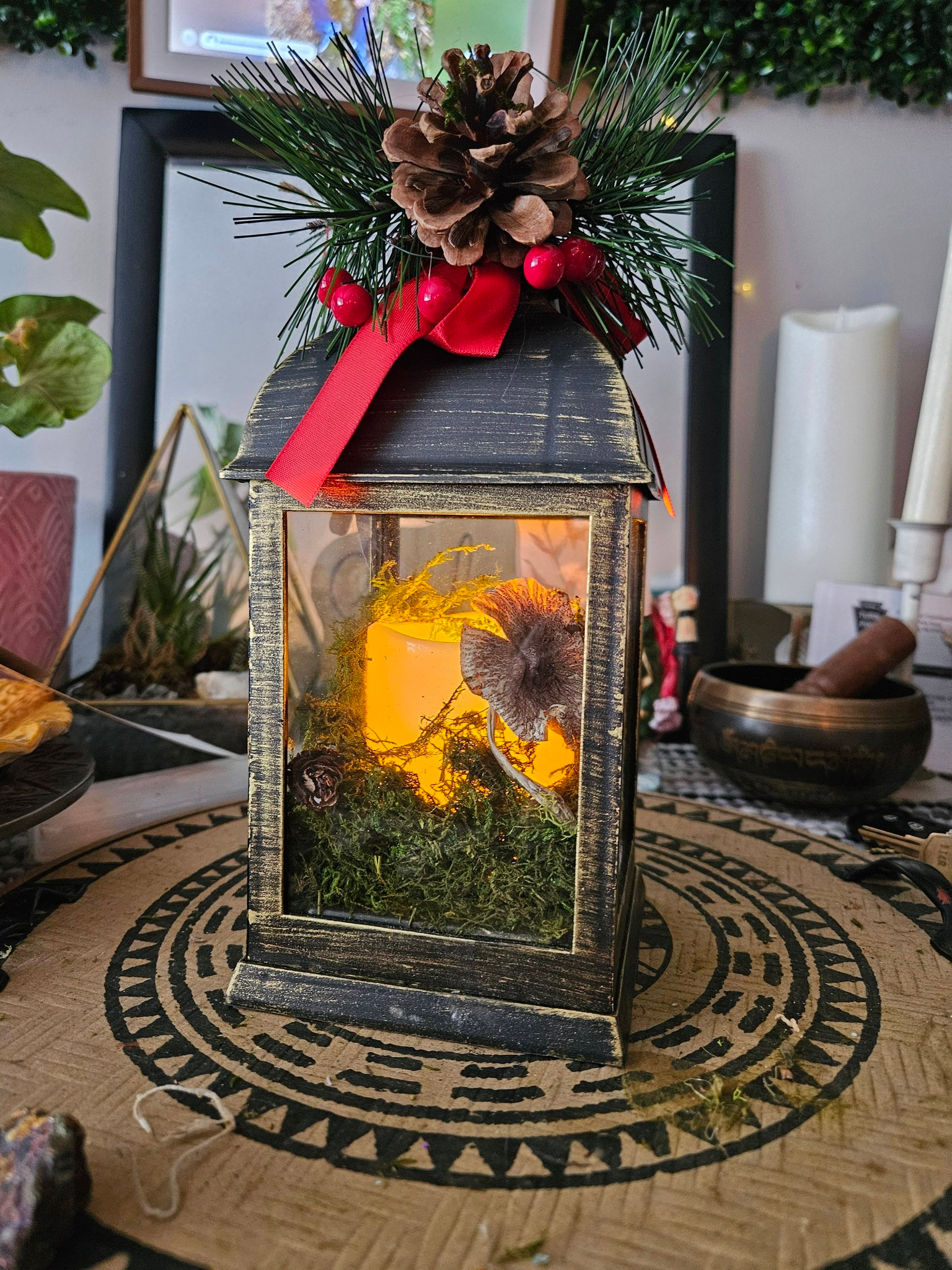 Once a forgotten Christmas lantern, now reborn into woodland magic — crowned with foraged mushrooms, pine cones, and a gentle candle’s glow that whispers of winter forests and fae gatherings.